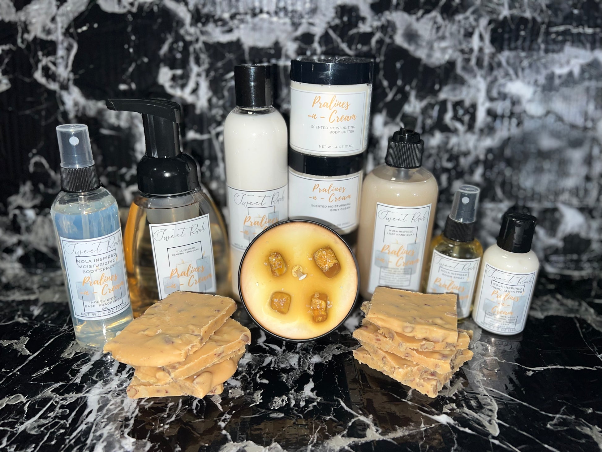 Pralines (also known as Pecan Candy) are a sweet dessert in New Orleans, which is a cross between pecan caramel and fudge. The majority of pralines are made from heated butter, sugar, vanilla, and pecans, but they can come in a variety of flavors, shapes, and forms. This sweet dessert has inspired us to create a Pralines-N-Cream scent similar to a salted caramel with notes of salt, vanilla, caramel, and almond.