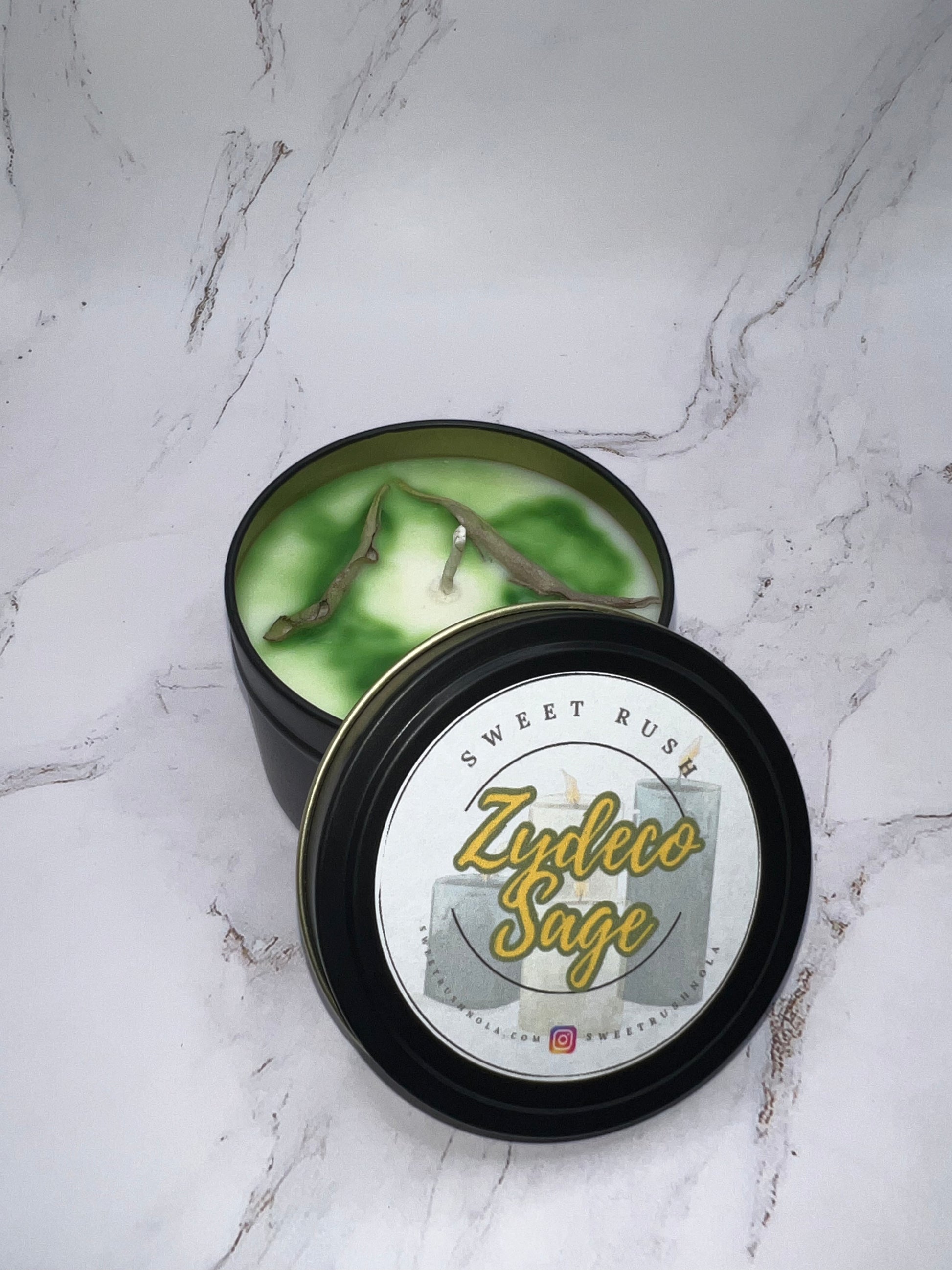 Zydeco Sage is a refreshing mix of spicy and bright scents. This candle is as up beat as Zydeco music. This scent has notes of pineapple, citrus, and sage.